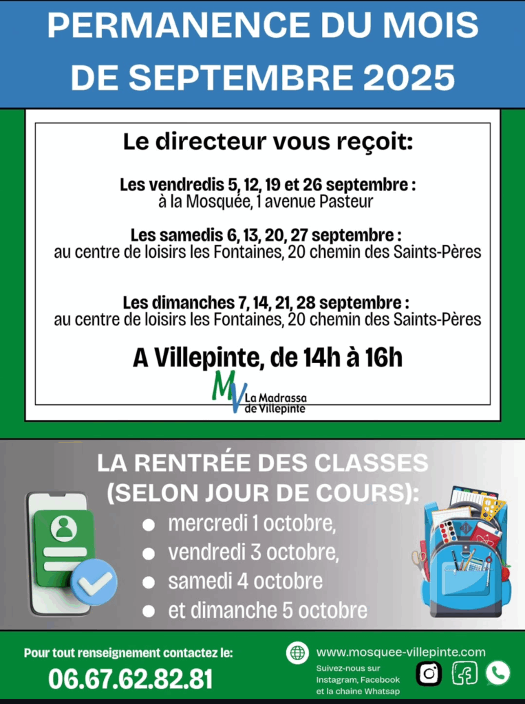 Vous avez la possibilité de remplir le dossier d’inscription en l’imprimant et en l’apportant signé, complété et accompagné du moyen de paiement à la Madrassa de Villepinte durant les jours de permanence.